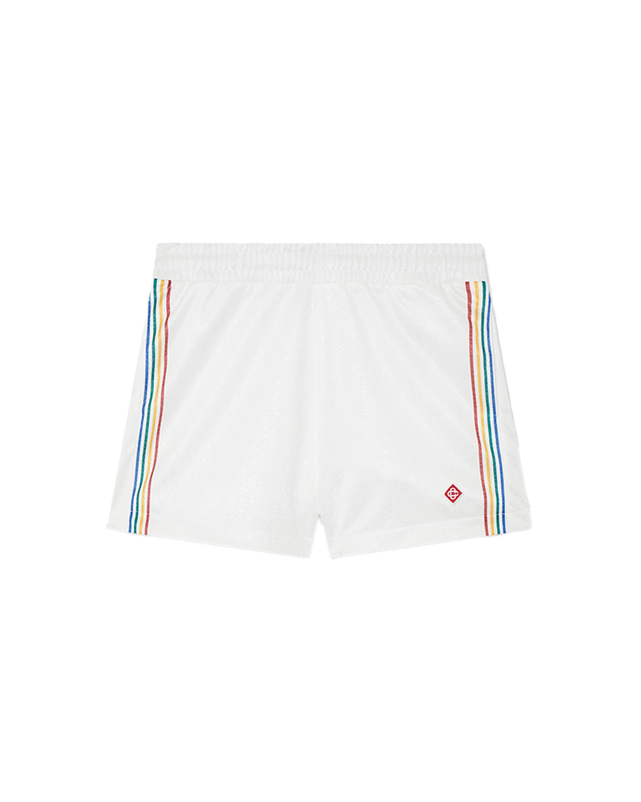 The Jacquard monogram football shorts are a sportswear design featuring the house's signature diamond monogram. Crafted from a jacquard monogram fabric and completed with an elasticated waistband, drawstring fastening, the house's signature diamond logo applique, stripe details down the sides, and a Casablanca logo across the chest. - Jacquard monogram fabric - Main: 100% polyester - Lining: 100% polyester - Diamond logo patch - Colour: bright white - Specialised dry clean only - Made in Portugal - Fits true to size, take your regular size - The model is 179cm/5'10.5 and is wearing a size S