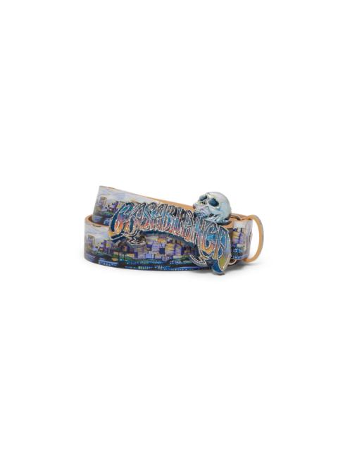 The La Premonition belt is a design featuring the house's seasonal artwork inspired by an eerie vision of the skyline of LA at night, with UFO elements touching on vintage sci-fi inspiration, crafted from calf leather. Completed with a painted brass buckle featuring hand-drawn typography of the Casablanca logo, inspired by the gothic typeface used in tattoos, in the season's gradient, and a skull. - Calf leather and brass - 100% calf leather - Buckle: 100% brass - La Premonition multicolour - Clean with a soft dry cloth - Made in Italy