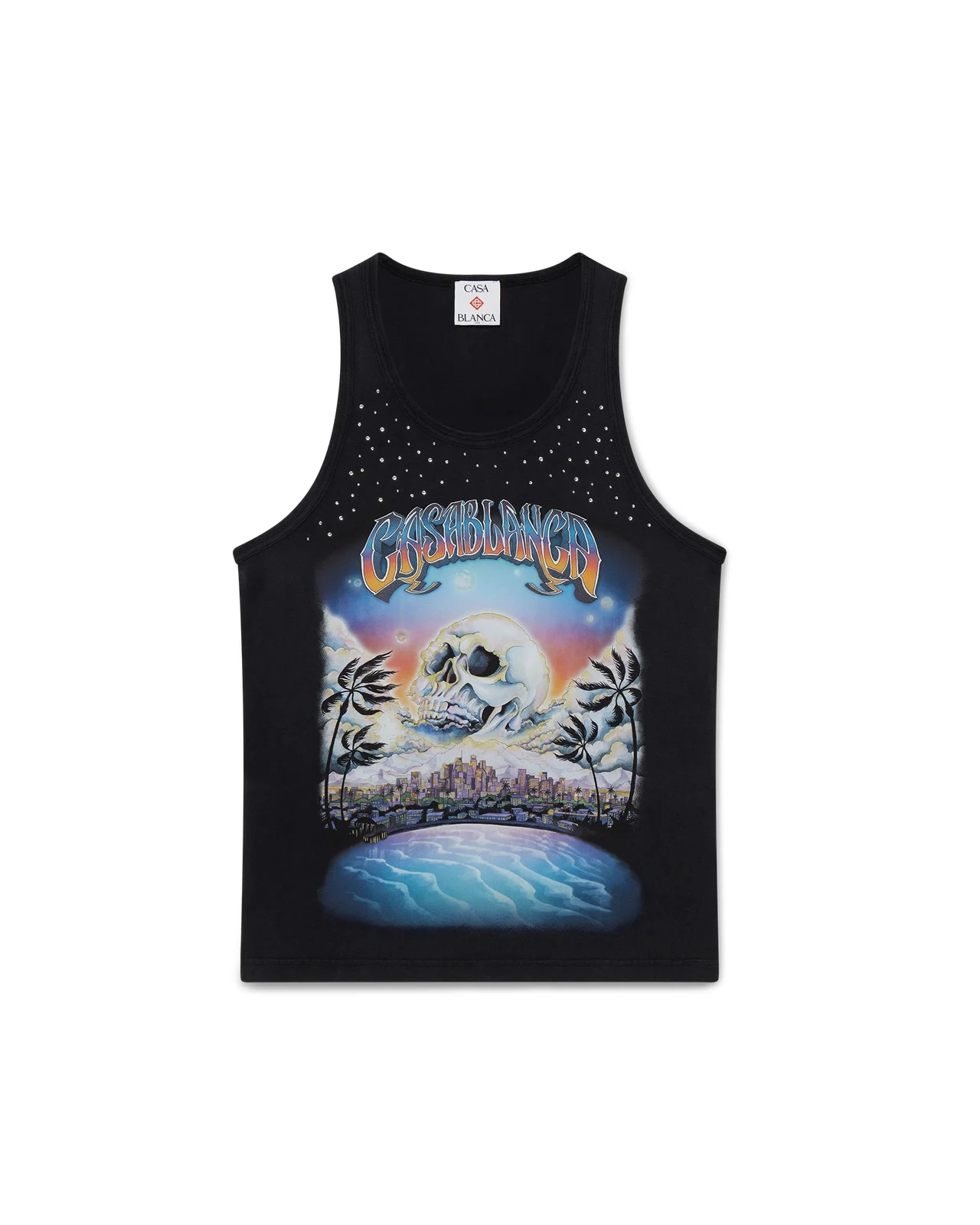 The La Premonition Crystal tank top is a sleeveless printed design crafted from organic cotton blend fabric and hotfix crystals featuring signature artwork inspired by an eery vision of the skyline of LA at night, with UFO elements touching on vintage sci-fi inspiration. Completed with hotfix crystals and a classic scoop neck. - Printed cotton blend fabric - 95% organic cotton 5% elastane - Colour: black multicolour print - Specialised dry clean - Made in Portugal