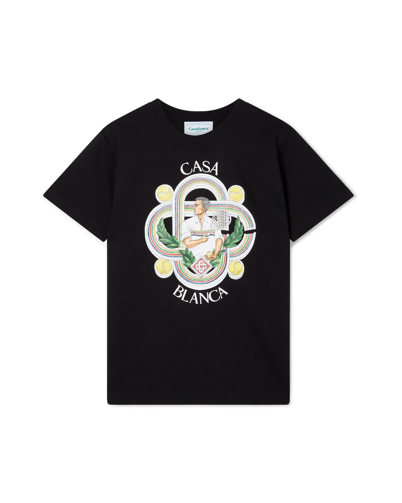 The Le Joueur screen-printed organic cotton t-shirt features seasonal artwork incorporating the house's signature tennis iconography. Completed with a classic crewneck, short sleeves and Casablanca Paris branded label, designed for a relaxed fit. 100% organic cotton Colour: black Delicate machine wash Made in Portugal Unisex fit, take your regular size The model is 187cm/6’1 and is wearing a size M
