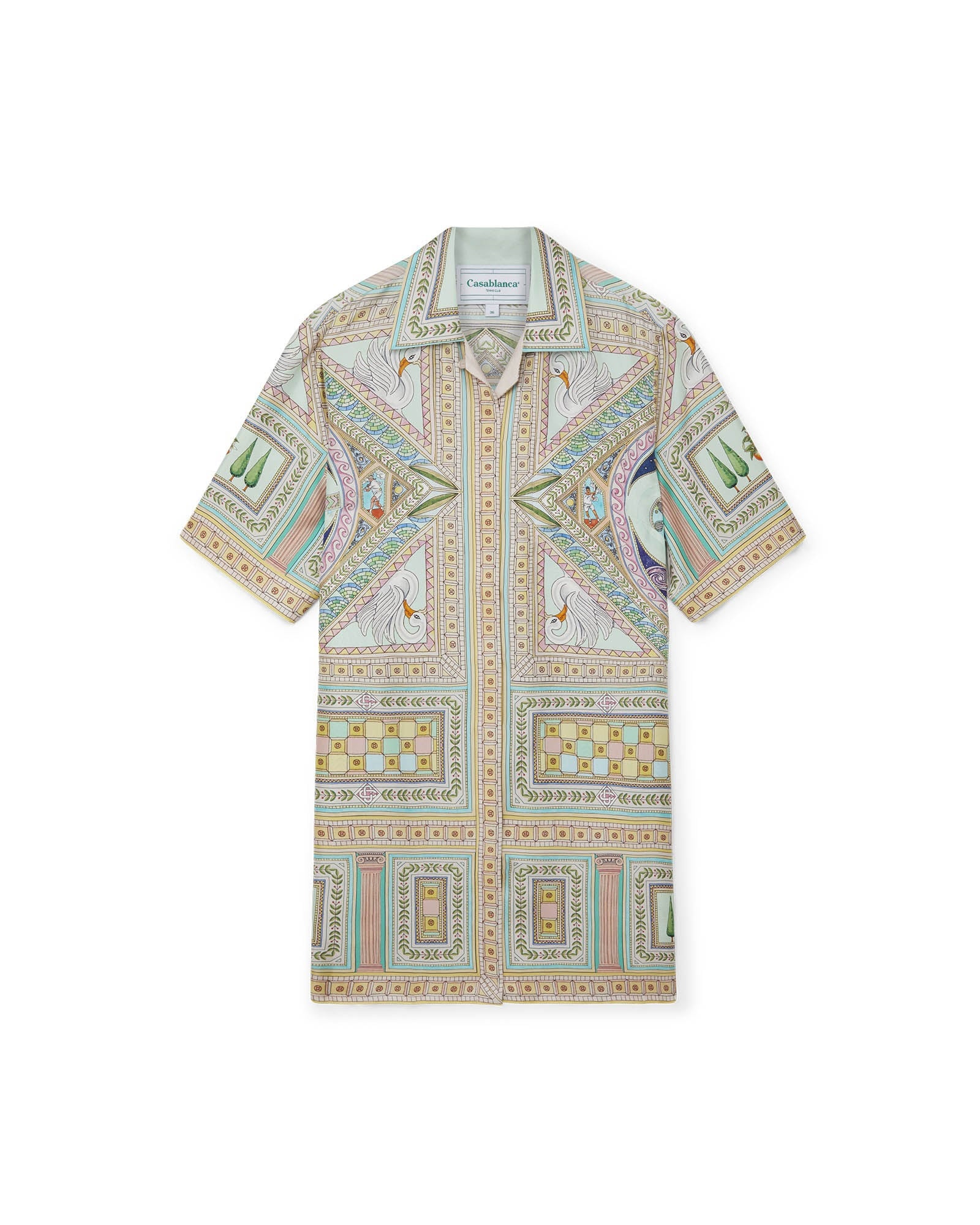 The Le Labyrinthe short-sleeve printed silk shift dress features Casablanca symbology with Arabic iconography and our signature diamond monogram in seasonal tones. Finished with a collar, and front button closure and designed for a classic fit. Printed silk twill fabric 100% silk Le Labyrinthe print multicolour Specialised dry clean only Made in Italy Fits true to size, take your regular size The model is 177cm/5’10 and is wearing a size 36/8UK