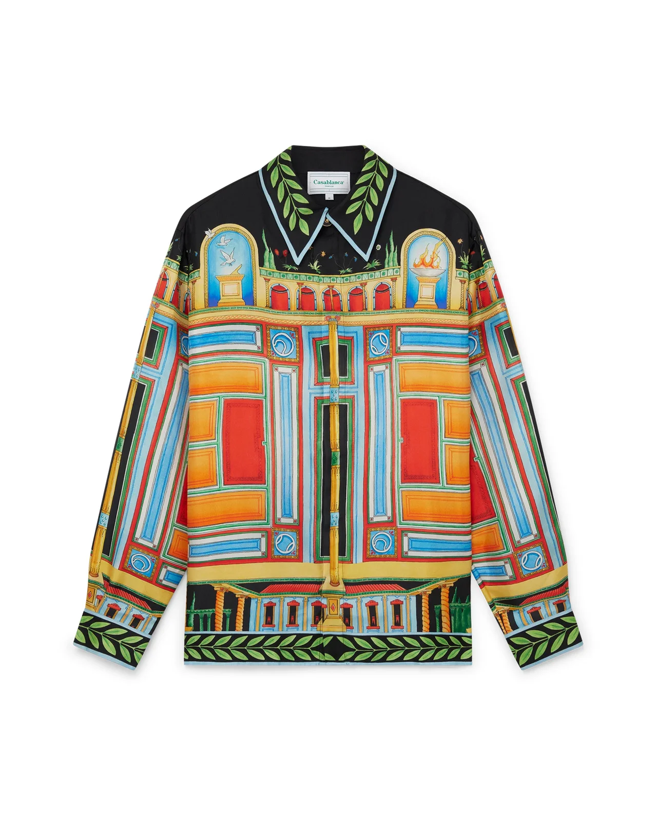 The Le Palais en Fleur silk shirt is a long-sleeved all-over printed design featuring seasonal artwork inspired by Pompeii's architectural history, its vibrant colours, and symmetry, crafted from a silk twill fabric. Completed with the house's signature gold-rim pearl buttons, button closure, a Cuban collar, and signature Laurel leaf artwork on the cuffs, hem, collar and placket. - Printed silk twill fabric - 100% silk twill - Le Palais En Fleur multicolour - Specialised dry clean only - Made in Italy - Unisex fit, take your regular size