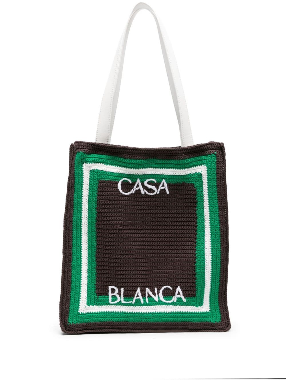 logo-embroidered crochet tote bag Casablanca's laid-back aesthetic is on full show with this tote bag, which features a crochet design and comes in a black and green colourway. In a signature twist, it's embroidered with the label's logo in contrasting white threads. Highlights - Black/white/green - Crochet knit - Embroidered logo to the front - Two long top handles - Leather top handles - Main compartment Imported Composition Outer: Leather 100%, Nylon 100% SIZE & FIT Model measurements Height 6 ft 2 in(1.88 m) Bust/Chest 36.61 in(93 cm) Hips 35.82 in(91 cm) Waist 27.95 in(71 cm) Measurement DEPTH 2.75 in(7 cm) HANDLE 10.23 in(26 cm) HEIGHT 14.56 in(37 cm) WIDTH 12.99 in(33 cm)