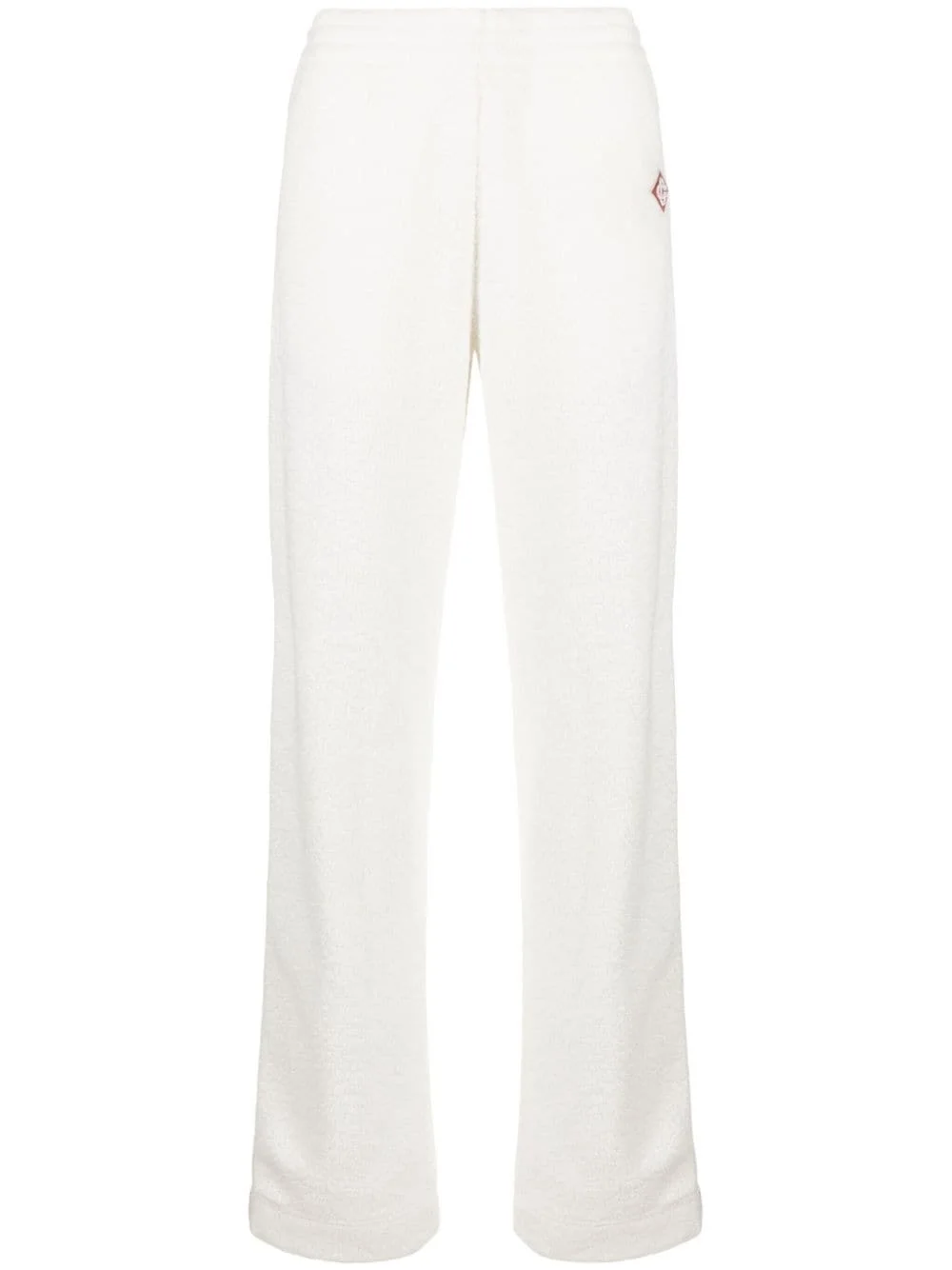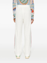 logo-patch side-stripe fleece track pants Casablanca's ‘modern reimagining of the timeless apres-sport aesthetic’ is encapsulated by these knitted trousers. Modelled on classic track styles, the off-white design is decorated with contrasting red and blue side stripes that lend athleisure appeal. Highlights - Off-white - Wool-cashmere blend - Boucle construction - Fleece texture - Side stripe detailing - Elasticated waistband - Logo patch to the side - Slip pockets to the sides - Straight leg Imported Composition Modal 39%, Polyamide 17%, Wool 17%, Polyester 14%, Cashmere 13% SIZE & FIT Model measurements Height 5 ft 10 in(1.78 m) Bust/Chest 33.07 in(84 cm) Hips 36.61 in(93 cm) Waist 24.8 in(63 cm) FittingInformation Designed for a straight-leg fit, these trousers allow for a close fit at the waist and an unrestricted, comfortable fit over the leg The elasticated waist allows for a comfortable fit Made from a midweight non-stretch fabric, this piece offers minimal elasticity when worn This piece fits true to size – take your usual size