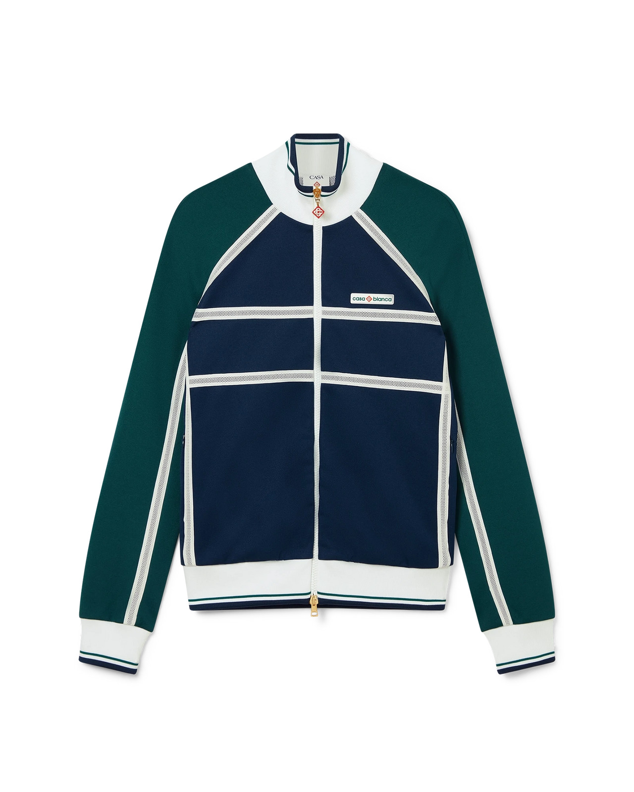 The mesh tape track jacket is a sportswear-inspired design crafted from a tricot fabric. Completed with a zip closure, panels with white piping details, a rib collar, cuffs and hem with stripe details, side pockets, mesh tape detail, and the house's signature Casablanca logo. - Tricot fabric - Main: 31% cotton 22% viscose 21% polyamide 14% polyester 11% recycled polyester 1% elastane - Lining: 100% polyester - Colour: navy/green - Specialised dry clean only - Made in Hungary - Fits true to size, take your regular size - The model is 176cm/5'9.5 and is wearing a size S