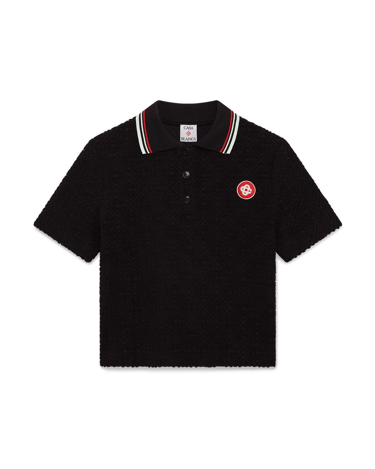 The monogram jacquard towelling polo shirt is a short-sleeve design crafted from monogram towelling fabric. Completed with button closure, interlocking CC logo corozo buttons, a CC logo patch, and a rib collar with stripe edge detail. - Monogram towelling fabric - Main: 86% cotton 13% polyamide 1% elastane - Colour: black - Specialised dry clean only - Made in Portugal - The model is 177cm/5'9.5 and is wearing a size S