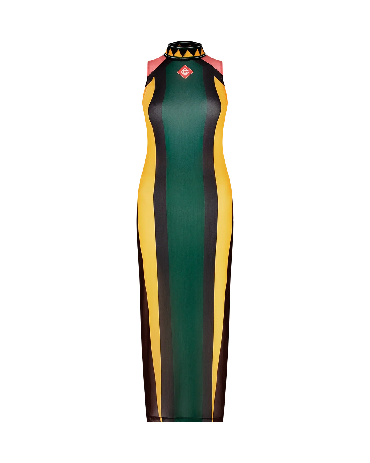 The motor mesh dress is a sleeveless printed design inspired by Nigeria, crafted from a sheer mesh fabric featuring panels of colours and the house's signature diamond logo on the chest. Completed with a polo neck, and a low-cut open back. Printed mesh fabric 93% recycled polyester 7% elastane Colour: Motor print multicolour Specialised dry clean only Made in Portugal