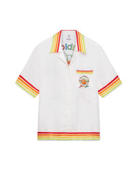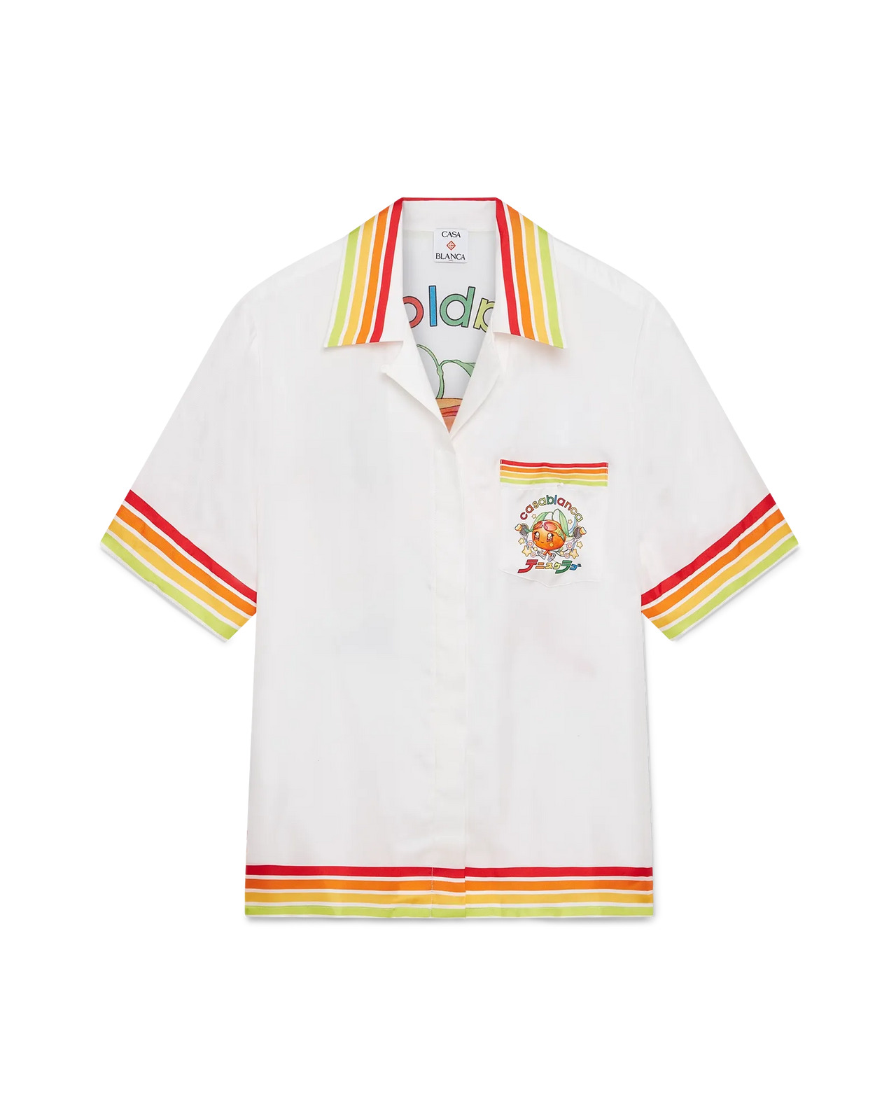 The Kawaii orange mascot silk twill short-sleeve shirt is a printed design featuring seasonal artwork of the Kawaii orange - this character, designed as an orange is a key figure in our universe, featuring Casa accessories, glasses, and sneakers. She is primarily featured in the women's styles in the collection. Completed with a Cuban collar, button closure, interlocking CC logo corozo buttons, a breast pocket, and red, orange, yellow and green stripe edge detail on the collar, cuffs, hem and pocket. - Silk twill fabric - 100% silk - Colour: white - Specialised dry clean only - Made in Italy - Relaxed fit - The model is 187cm/6'1 and is wearing a size M