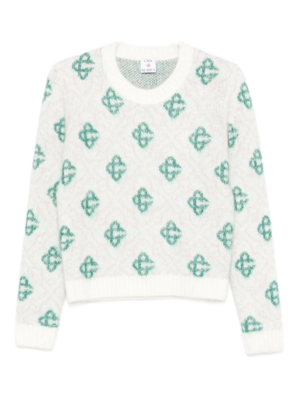 patterned crew-neck sweater Highlights - White - Teal pattern - Crew neck - Long sleeves - Ribbed hem Imported Composition Nylon 36%, Cotton 25%, Wool 20%, Mohair 19% SIZE & FIT Model measurements Height 5 ft 10 in(1.79 m) Bust/Chest 31.88 in(81 cm) Hips 35.43 in(90 cm) Waist 23.62 in(60 cm) Washing instructions Hand Wash