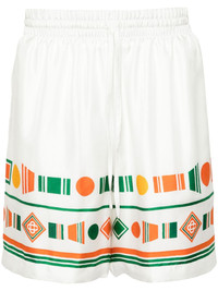 Playful Eagle silk shorts Inspired by Nigeria, Casablanca showcases a playful geometric design that embellishes these white shorts. The relaxed silhouette is made from soft silk. Highlights - White/multicolour - Silk - Satin weave - Geometric print - Elasticated drawstring waistband - Two side slit pockets - Rear patch pocket - Straight hem - Full lining - Thigh-length - When buying this unisex item, keep in mind that it is graded in standard men's sizing. Made in Italy Composition Lining: Polyester 100% Outer: Silk 100% SIZE & FIT Model measurements Height 6 ft 2 in(1.87 m) Bust/Chest 36.22 in(92 cm) Hips 37 in(94 cm) Waist 27.95 in(71 cm) FittingInformation Designed for relaxed fit, offering a comfortable loose fit over the leg Adjust this piece’s waistband to your preference using the drawstring Made from a lightweight non-stretch fabric This piece fits true to size – take your usual size