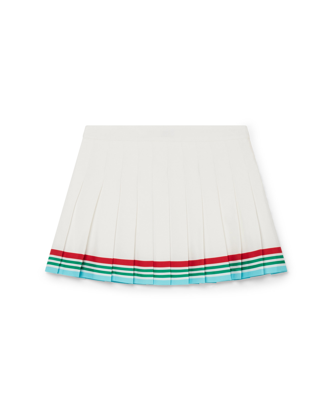 The Casa Way World Series pleated skirt is a mini-style crafted from silk twill fabric. Completed with a plain waistband, pleated panel, a red, white, green, and blue horizontal stripe hem detail, side zip closure, and a lining. - Silk twill fabric - Main: 100% silk - Lining: 100% polyester - Colour: white - Specialised dry clean only - Made in Italy - The model is 180cm/5'11 and is wearing a size S