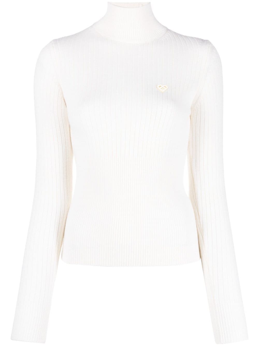 ribbed-knit wool jumper Spun from wool fibres in a ribbed knit, this white Casablanca jumper boasts a minimalist, refined roll-neck silhouette punctuated with the brand's Heart Monogram plaque at the chest, adding a sweet hint of branding. Highlights - White - Wool - Ribbed knit - Monogram plaque - Roll neck - Long sleeves - Straight hem Imported Composition Wool 100% SIZE & FIT Model measurements Height 5 ft 10 in(1.77 m) Bust/Chest 31.88 in(81 cm) Hips 36.22 in(92 cm) Waist 24.01 in(61 cm) FittingInformation Designed for a close fit throughout Made with a midweight knit, this piece offers some stretch This piece fits true to size – take your usual size