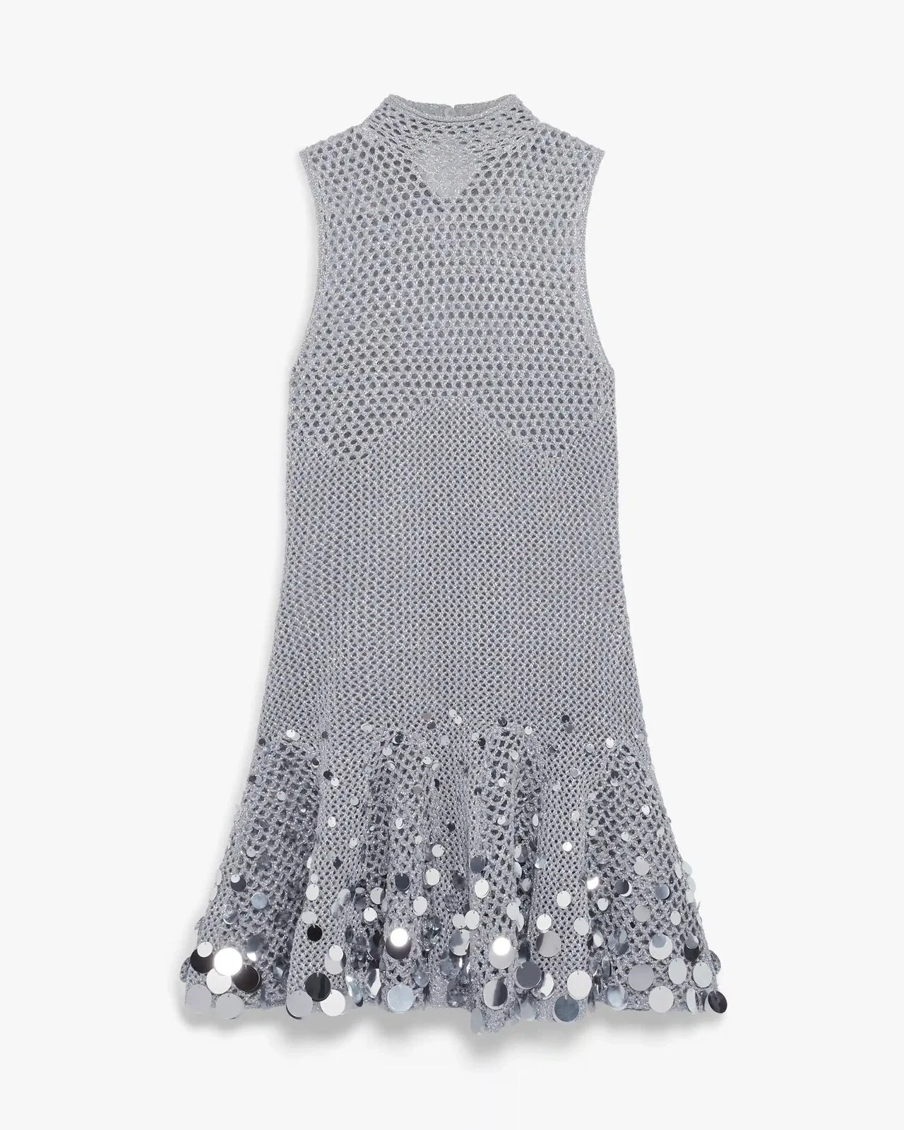 The silver crochet mirror mini dress is a refined knitted A-line design, featuring a delicate mirror crochet construction in silver. Completed with a high neckline and a fitted bodice, a sleeveless silhouette. - Silver crochet fabric - 65% polyester 35% metallic - Colour: silver - Specialised dry clean only - Made in China - The model is 176cm/5'9.5 and is wearing a size s - Slim fit