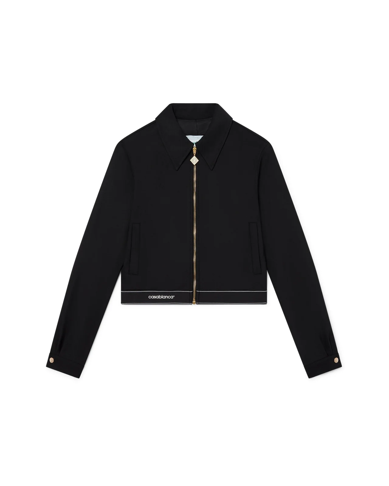 The sports tailoring jacket is a short design crafted from a wool-blend fabric. Completed with a point collar, an elasticated tape hem featuring the Casablanca logo and white stripe detail - designed to be worn with its matching trousers. Wool blend fabric 53% polyester 43% virgin wool Colour: black Specialised dry clean only Fits true to size, take your regular size The model is 177cm/5’10 and is wearing a size S