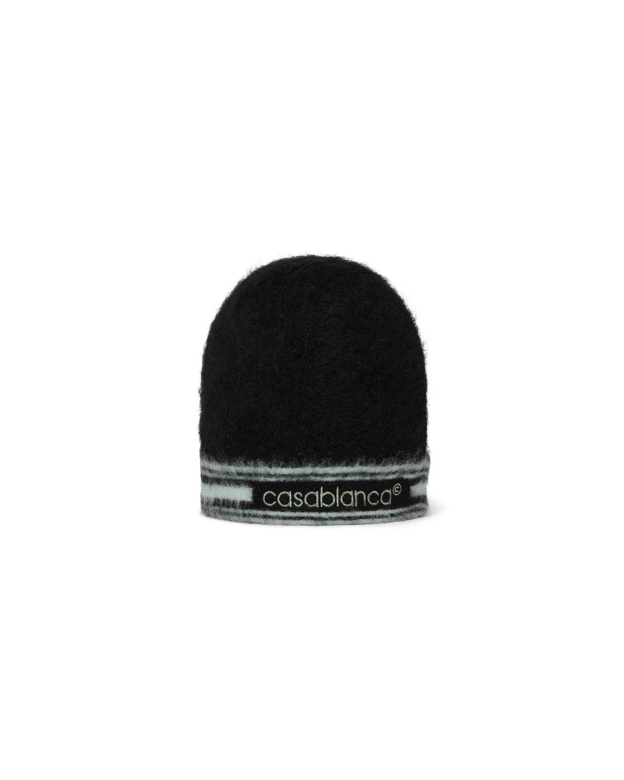 The stripe mohair beanie is a knitted design crafted from mohair fabric. Completed with the Casablanca logo and stripe detail around the brim. - Mohair blend fabric - 33% mohair 33% wool 28% nylon 6% elastane - Embroidery: 100% polyester - Colour: black - Specialised dry clean only - Made in China