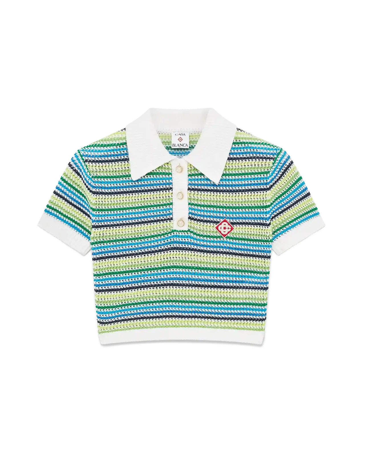 The stripe polo shirt is a cropped short-sleeve design featuring the house's signature diamond logo. Completed with stripe knitted fabric, button placket, signature gold rim pearl buttons, and a ribbed collar, cuffs and hem detail. - Striped cotton fabric - 100% cotton - Diamond logo patch - Colour: green - Specialised dry clean only - Made in China - Slim fit - The model is 177cm / 5'9 and is wearing size S - Exclusive to casablancaparis.com and our Paris and LA flagship stores