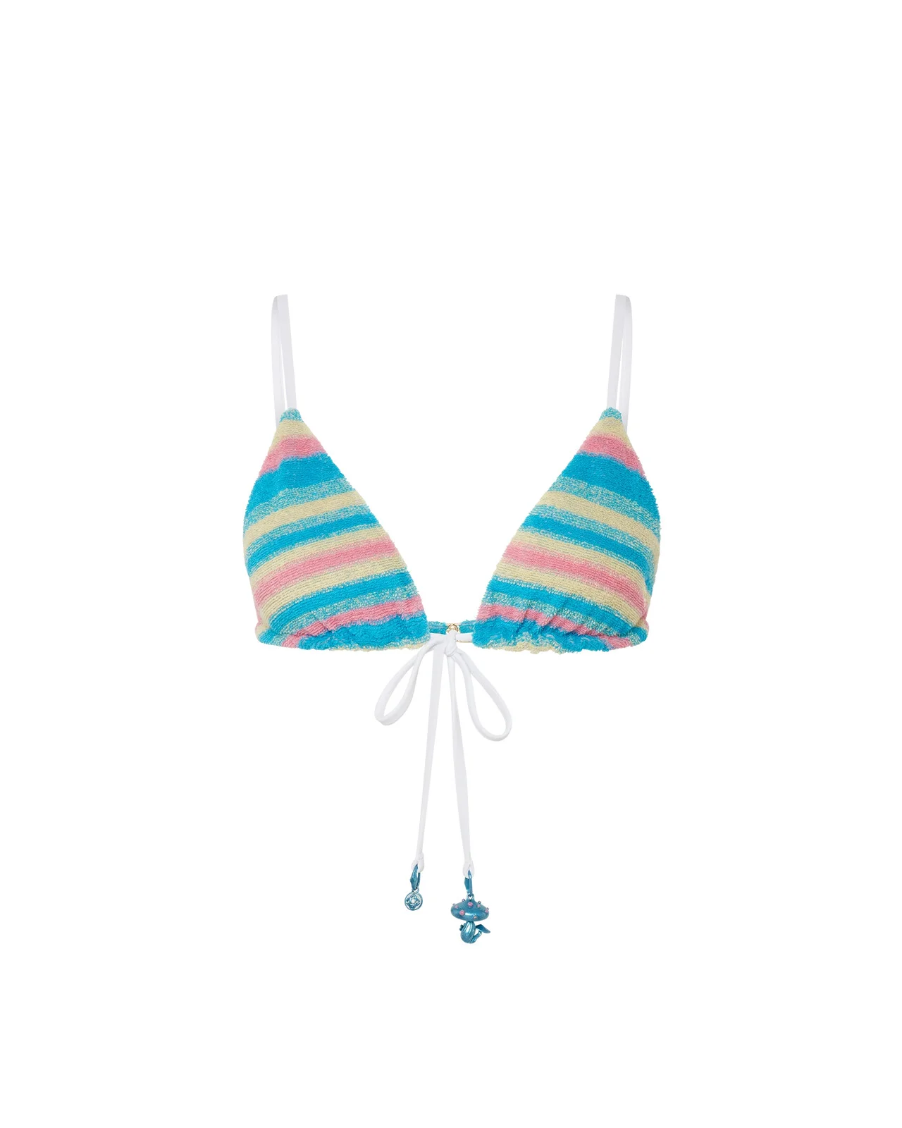 The stripe towelling bikini top is crafted from towelling fabric featuring the house's gold-plated interlocking CC rivet. Completed with a contrast drawstring fastening at the neck and back, finished with the house's seasonal mushroom and CC logo charms. - Stripe towelling fabric - 89% cotton 11% polyamide - Colour: stripe multicolour - Delicate machine wash - Made in Portugal -