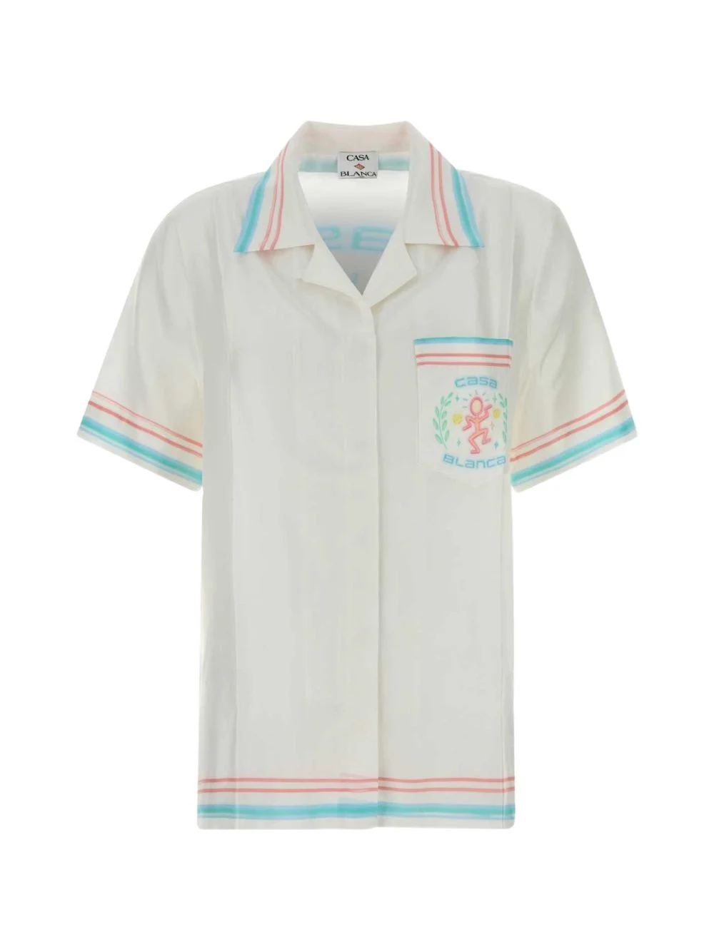 striped-trim shirt Highlights - White - Silk - Short sleeves - Chest patch pocket - Dance joy motif - Striped trim - Concealed front fastening Made in Italy Composition Silk 100% Washing instructions Read Manufacturer Guidelines
