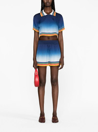 Studio De Musique silk shorts Spotlighting Casablanca's focus on vibrant colours and motifs, these Studio De Musique shorts feature a tonal-blue gradient design and rainbow-striped hems. The label's monogram saturates the silk base, while a bold graphic graces the back. Highlights - Blue - Silk - Monogram print - Stripe detailing - Gradient effect - Rear patch pocket - Elasticated waistband - Straight hem Made in Italy Composition Lining: Polyester 100% Outer: Silk 100% SIZE & FIT Model measurements Height 5 ft 11 in(1.8 m) Bust/Chest 34.25 in(87 cm) Hips 35.82 in(91 cm) Waist 24.8 in(63 cm) FittingInformation Designed for a relaxed, roomy fit The elasticated waist allows for a comfortable fit Made from a lightweight non-stretch fabric This piece fits true to size – take your usual size