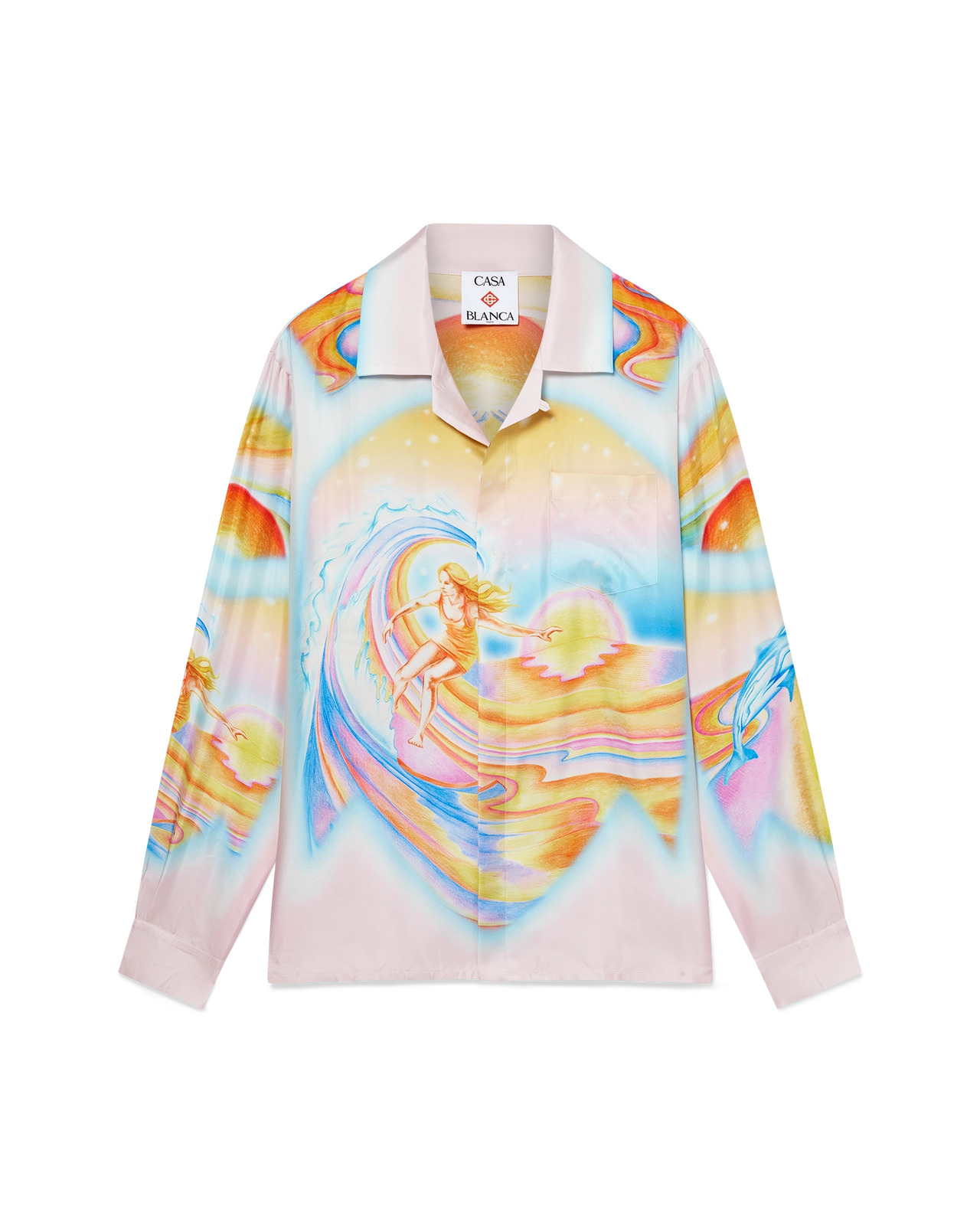 The Psychedelic Nirvana silk shirt is an all-over printed design crafted from silk twill fabric featuring artwork inspired by 70s airbrushed surfboards in California using pastel colours which give the print an almost dream-like, idealistic feeling. Finished with a Cuban collar, a breast pocket, hidden button closure with interlocking CC corozo buttons, and a gold rim enamel button on each cuff. - Silk twill fabric - 100% silk - Psychedelic Nirvana multicolour - Specialised dry clean only - Made in Italy - The model is 187cm/6'1 and is wearing a size M