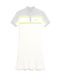 The tennis polo dress is a short-sleeve knitted design featuring contrast shoulders and outer-sleeves. Completed with a zip closure featuring the house's signature diamond logo zipper tab, a high collar, striped detail, signature Casablanca logo, ribbed cuffs, and frill-type hem details. - Technical knit fabric - 83% viscose 17% polyamide - Casablanca embroidery - Colour: white - Specialised dry clean only - Made in China - Slim fit