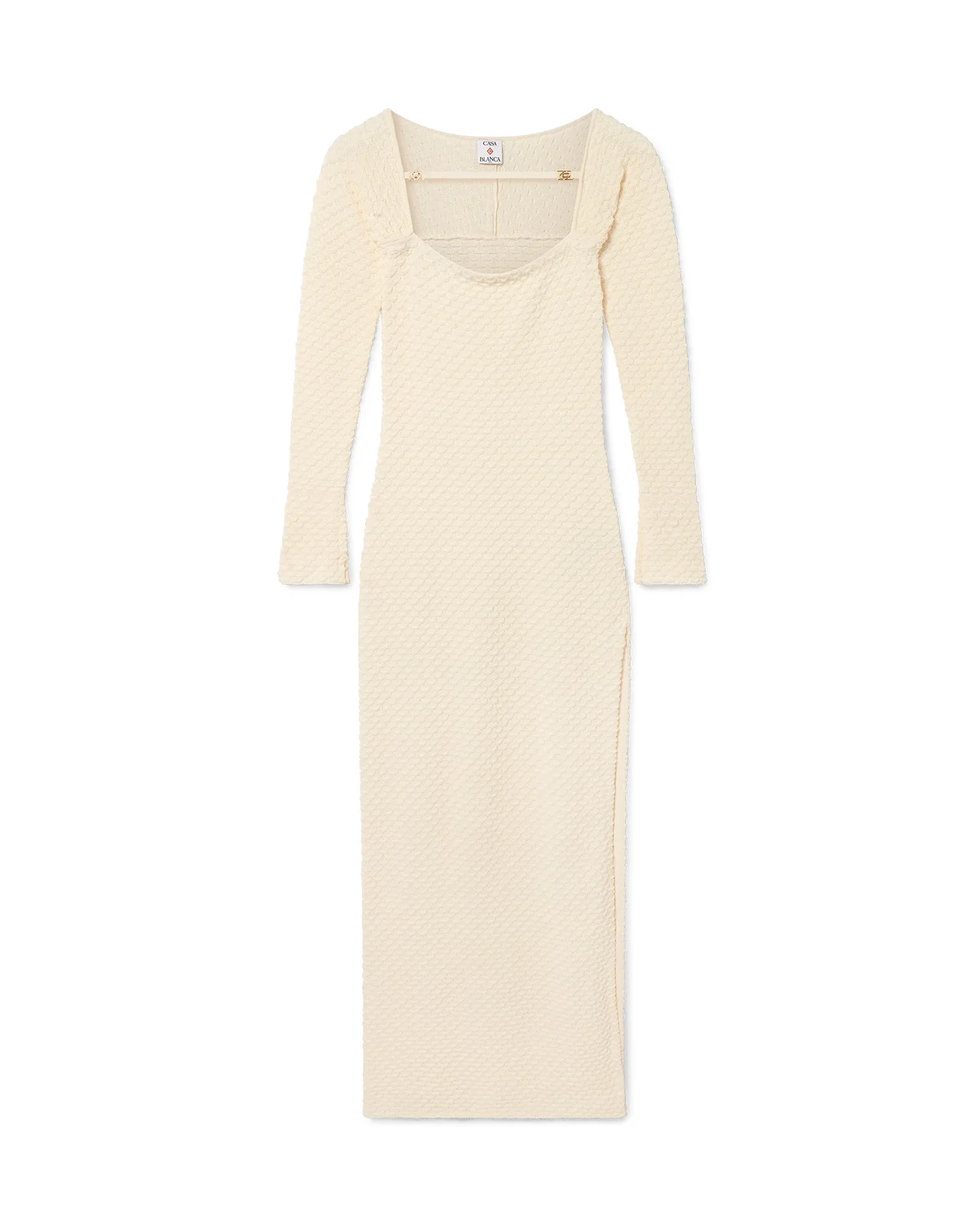 The textured knitted dress is a long-sleeve maxi style crafted from cotton blend fabric. Completed with a boat neckline, slitted sleeves, and hem to thigh slit. - Cotton blend fabric - 65% cotton 35% polyamide - Colour: white - Specialised dry clean only - Fits true to size, take your regular size - The model is 179cm/5'10.5 and is wearing a size S