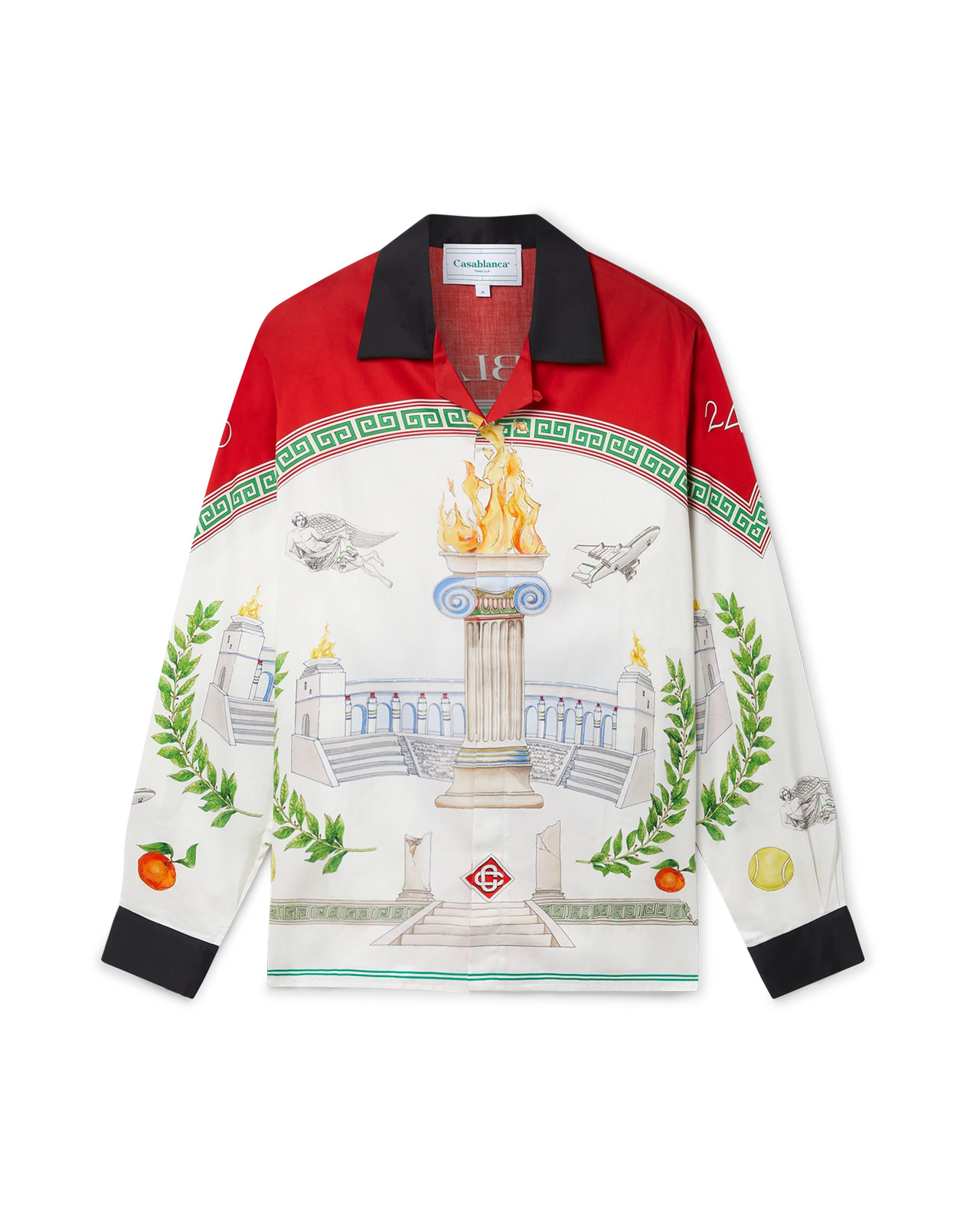 The Unique Games cotton shirt is a long-sleeved all-over printed design crafted from a cotton fabric featuring the house's seasonal artwork inspired by ancient Greece. Completed with the house's signature gold-rim enamel buttons, button closure, a Cuban collar, contrast collar and cuffs, and stripe detail on the hem, with Greek wave detail across the chest and back. - Printed cotton fabric - 100% cotton - Unique Games print multicolour - Specialised dry clean only - Made in Italy - Unisex fit, take your regular size -