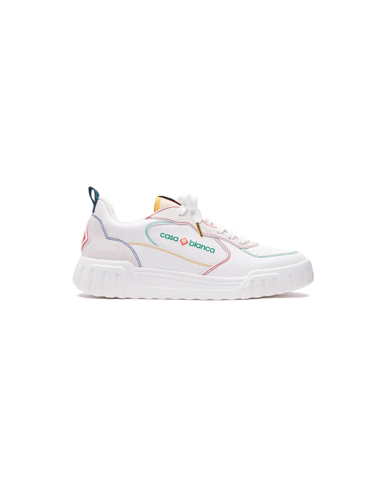 The design language of the Court Sneaker reflects the iconic silhouettes of the 90s. The colours featured throughout the rubber sole are a combination of the refined codes of tennis and classic architecture and create a unified palette throughout the shoe, with the focus on primary colours offset by tennis whites to create a sport focus colour story. Tonal white leather upper Branded Casablanca diamond rubber patch on the heel Silicon Casablanca Sport branding on lateral side Woven Court tongue label Tennis Court inspired outsole realised in tennis inspired primary colours Gold lace tips Customs & Duties Please note that import duties and taxes may be charged on delivery for any customers outside the EU. Please check with your country's customs office to determine your local import duties and taxes before purchasing. You may wish to wear your smaller size if you are in between sizes. - Tonal white leather upper - Branded Casablanca diamond rubber patch on the heel - Silicon Casa Sport branding on lateral side - Woven Court tongue label - Tennis Court inspired outsole realised in tennis inspired primary colours - Gold lace tips