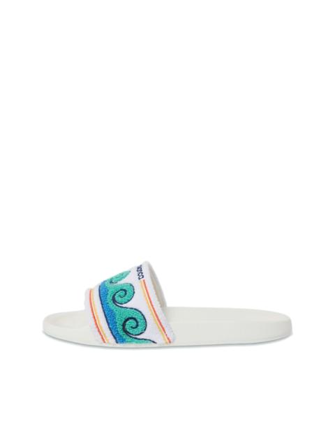 monogram flip flops Highlights - White - Monogram pattern - Teal embroidery - Navy blue embroidery - Open toe - Flat sole Imported Composition Outer: Cotton 100% Lining: Rubber 100% Sole: Rubber 100%
