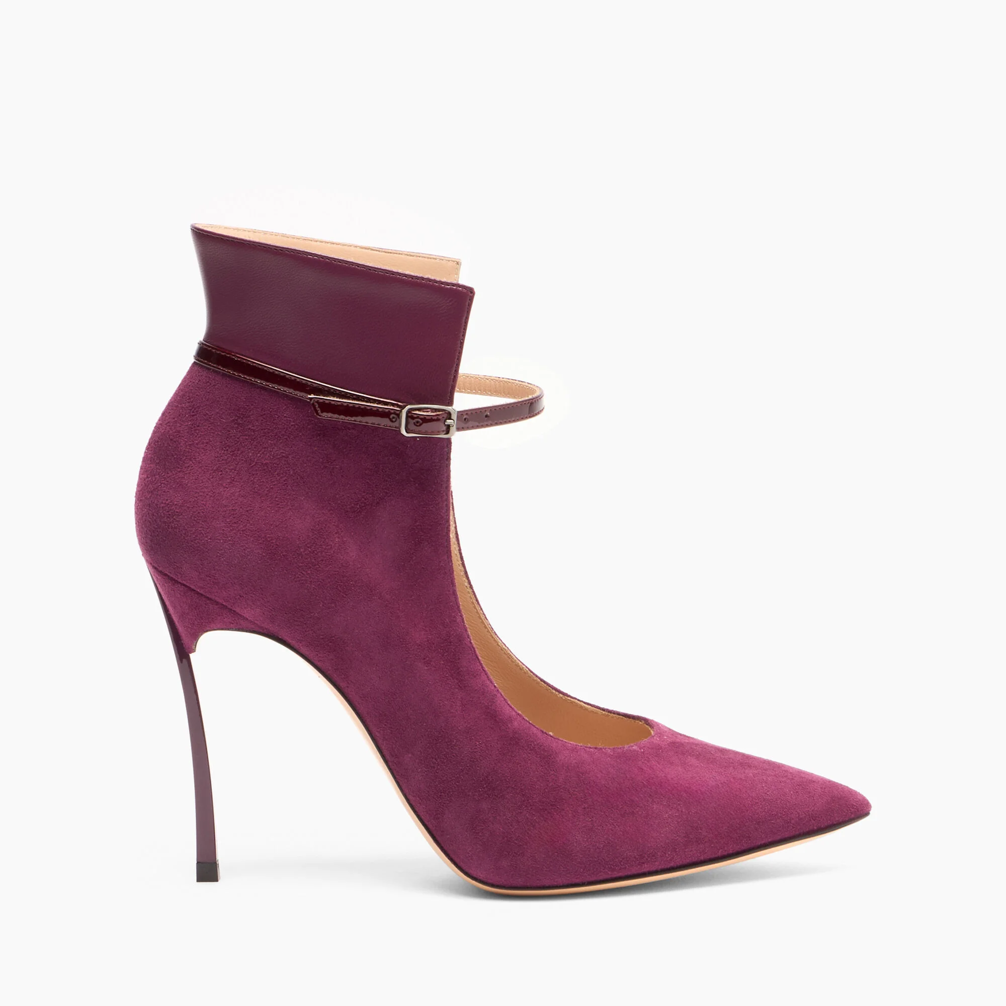 Casadei, which has always stood out for its leather cuts, presents for the Fall/Winter 25-26 collection the Blade Aurora in black cherry, one of the collection's signature colors. With a refined and elegant silhouette, the seductive neckline of this model is emphasized by the iconic hardened Blade heel, sharp as a knife blade. The ton sur ton leather and patent leather strap details make this model one of a kind. Details - Suede, patent leather with soft metallic finish to highlight the colour and brilliance and nappa leather - 50% kid and 50% calf - Blade heel in stainless steel 100 mm / 3.9 inches - 100% Made In Italy - Code: 1H038A100TT05344408