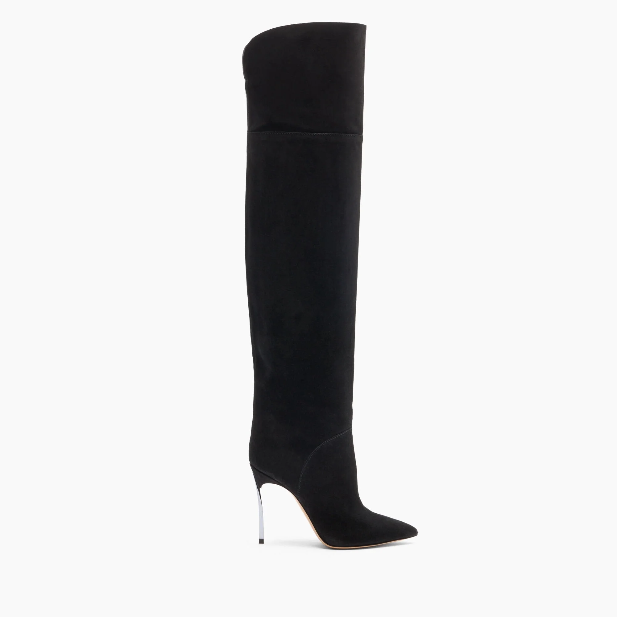 The it shoe of the season is the Corsair boot. Made of fine black suede, this over-the-knee boot is designed for the boldest and most sophisticated women. The Maison's iconic Blade heel, sharp and seductive, gives the model an extra dose of grit and style. The real innovation of this boot is its versatility: the top of the boot leg can be turned up, like a shirt sleeve. You can choose to leave it high for an elegant and refined look, or turn the cuff up for a more casual and dynamic effect. The Corsair boot is the perfect choice for those who want an accessory that fits every occasion, without sacrificing style and originality. Details - Suede - 100% Calf - Blade heel in stainless steel 100 mm / 3.9 inches - 100% Made In Italy - Code: 1T076A100MC18329000