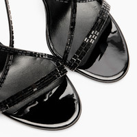 For all those who love to shine with sophistication, Casadei presents the Starsway sandal in black patent leather. Its play of luminous reflections creates a unique sparkling effect, catching every eye. The asymmetrical lines that wrap around the foot are embellished with tiny glimmers, similar to the sparkle of diamonds, adding a touch of magic. With the 10 cm Julia heel, this model will become a must-have in your wardrobe, ready to make you shine on any occasion! Details - Patent leather - 100% Calf - Patent leather covered heel 100 mm / 3.9 inches - 100% Made In Italy - Code: 1L402A1001T05369000
