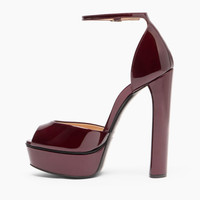For those who love heights, Casadei presents its iconic Flora platform in samurai, a black cherry-colored patent leather that features a delicate metallization that can enhance the model's colors and shine. This sandal, featuring a vertiginous chunky heel well balanced by a comfortable platform, secures at the ankle with a thin strap. It enhances the feminine silhouette, imparting sensuality and elegance. Details - Patent leather with soft metallic finish to highlight the colour and brilliance - 100% Calf - Patent leather covered heel 140 mm / 5.5 inches with plateau 40 mm / 1.5 inches - 100% Made In Italy - Code: 1L287Y1401SAMUR4408