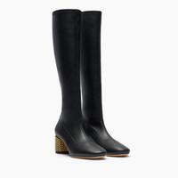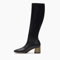 The Goldmember knee-high boot lights up with personality thanks to the chunky heel entirely decorated with pyramidal studs to sparkling effect. A jewel detail with a rock-chic flair, transforming the heel into a sophisticated sculpted spotlight. The metallics create vibrant reflections at every step, adding grit and sophistication to the essential black leather silhouette. A model designed for those who love to stand out in style, combining femininity and character in a perfect balance. Details - Stretch vegan nappa leather with a sporty and distinctly natural look - 60% Polyurethane and 40% Polyester - Steel heel covered with studs 50 mm / 1.9 inches - 100% Made In Italy - Code: 1S383A0501C28999000