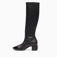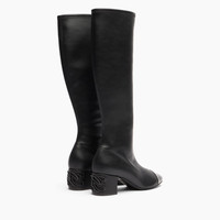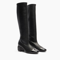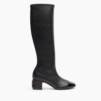 Sleek lines, black leather and a touch of glossy patent leather on the toe define the perfect balance between essentiality and character. This knee-high boot is distinguished by its chunky 5 cm heel, made unique by the iconic inlaid logo: a graphic and recognizable detail that turns functionality into style. The patent leather toe adds a glossy and sophisticated note, accentuating the material duality of the model. Ideal for enhancing midi dresses, straight skirts or slim pants, it elegantly accompanies the day from city routine to evening appointments, with effortless elegance. Details - Patent leather, stretch vegan nappa leather - 50% Calf, 30% Polyurethane and 20% Polyester - Leather covered heel with the C-Chain inlay 50 mm / 1.9 inches - 100% Made In Italy - Code: 1S388A0501T04409000