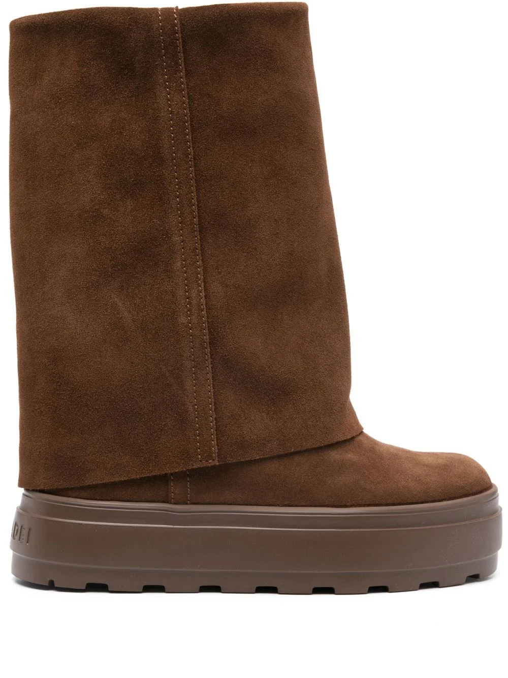80mm New Double Face boots Highlights - Chocolate brown - Calf suede - Slip-on style - 80mm wedge heel - Mid-calf length - Overlapping panel - Branded heel counter - Round toe - Branded leather insole - Flatform sole Made in Italy Composition Suede 100% SIZE & FIT Measurement CIRCUMFERENCE 12.2 in(31 cm) HEEL 1.57 in(4 cm) HEIGHT 8.66 in(22 cm) PLATFORM 1.57 in(4 cm)