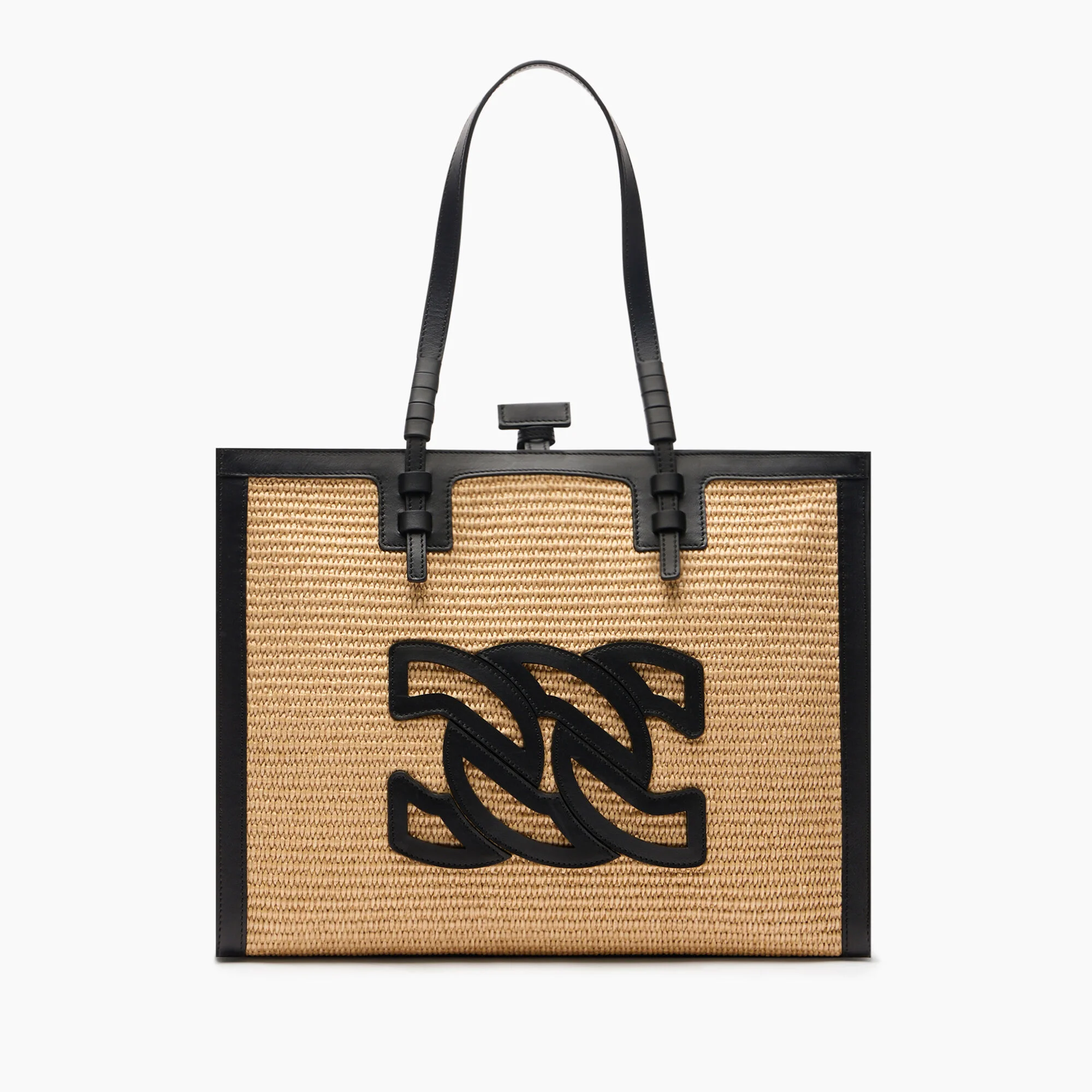 Casadei's Beaurivage tote bag in multicolored raffia and black leather details. It features a leather handle and a removable shoulder strap. The C-Chain logo makes this model one of a kind. Perfect style companion for city life but also for the beach. Details - Braided raffia - 52% Cotton and 48% PolyamideHeight 27 cm - Width 35,5 cm - Depth 14 cm - Shoulder strap 75 cm - Code: 3W457J0000BEAURMTCL