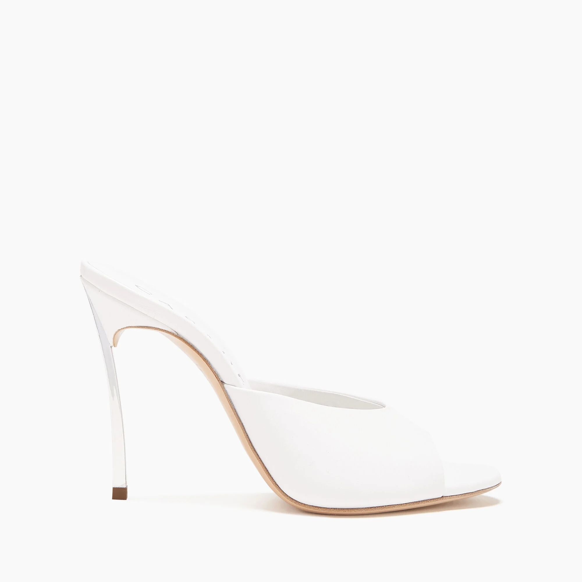 Casadei presents the It shoe of the season, defined by its purity of form. This white leather mule, featuring the iconic steel Blade heel, is the perfect summer accessory and a must in every woman's wardrobe. Details - Calfskin - 100% Kid Leather - Blade Heel In Real Steel 100 Mm / 3.9 Inches - 100% Made In Italy - Code: 1M889V100MC11559999
