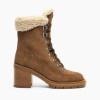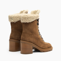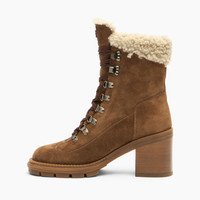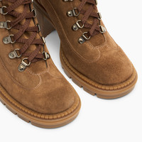 The essence of mountain style meets urban elegance in this Concept ankle boot. Made of soft clay-coloured suede, the model is embellished with a fur-effect shearling lining that provides thermal comfort and a touch of sophisticated softness. The rubber midsole guarantees stability and resistance, making it the ideal companion for the coldest days. The design is completed by metal hooks and a chunky 8 cm heel for comfort and security Details - Suede calfskin leather - 100% Calf - Leather covered heel 80 mm / 3.1 inches - 100% Made In Italy - Code: 1R542A0811C28843119