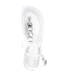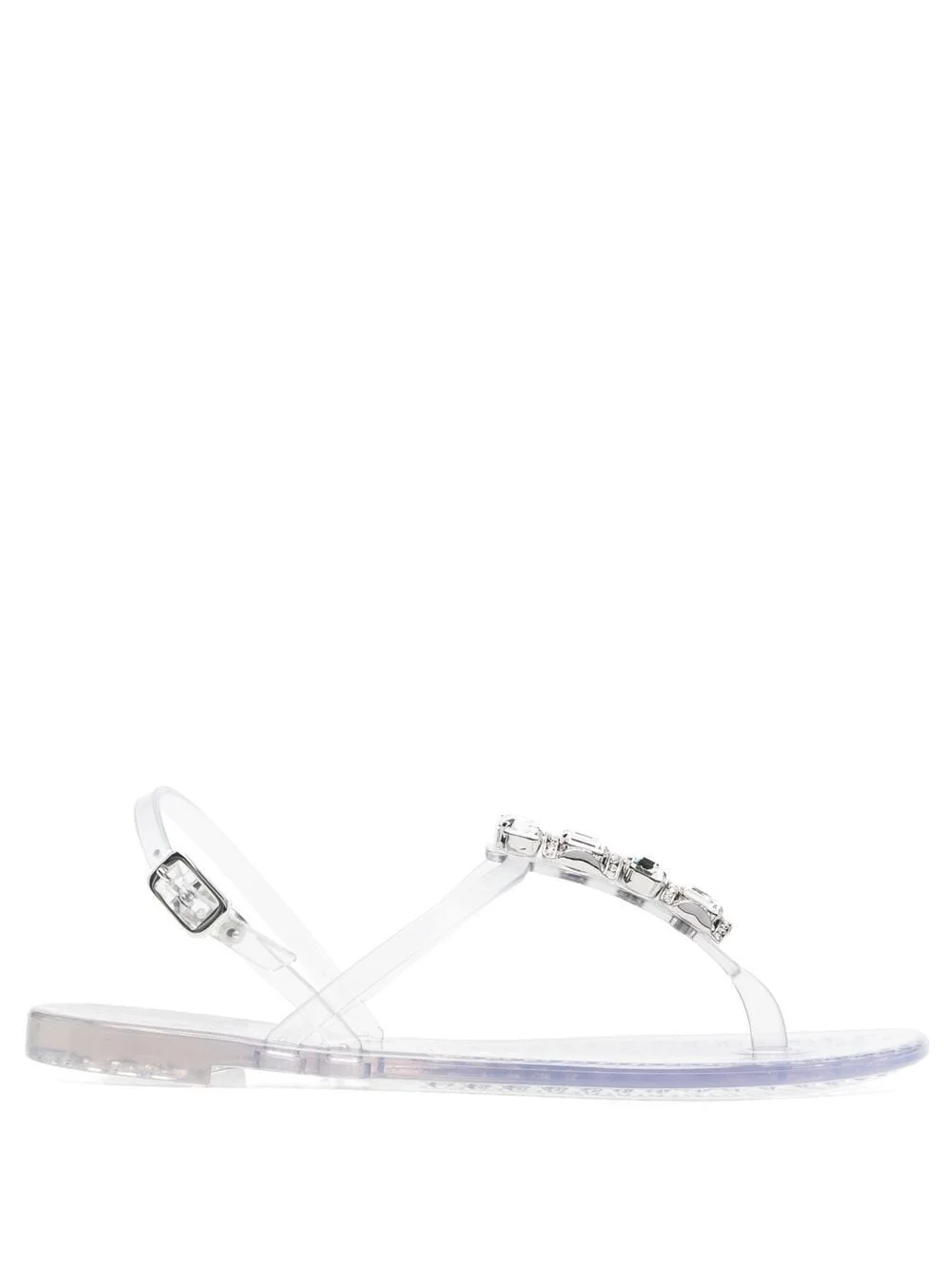crystal-embellished jelly sandals crystal-embellished jelly sandals from CASADEI featuring white, crystal embellishment, thong strap, slingback strap, side buckle fastening, branded insole and flat rubber sole. Made in Italy Composition Outer: glass 100%, PVC 100% Lining: PVC 100% Sole: PVC 100% SIZE & FIT Measurement HEEL 0.59 in(1.5 cm)