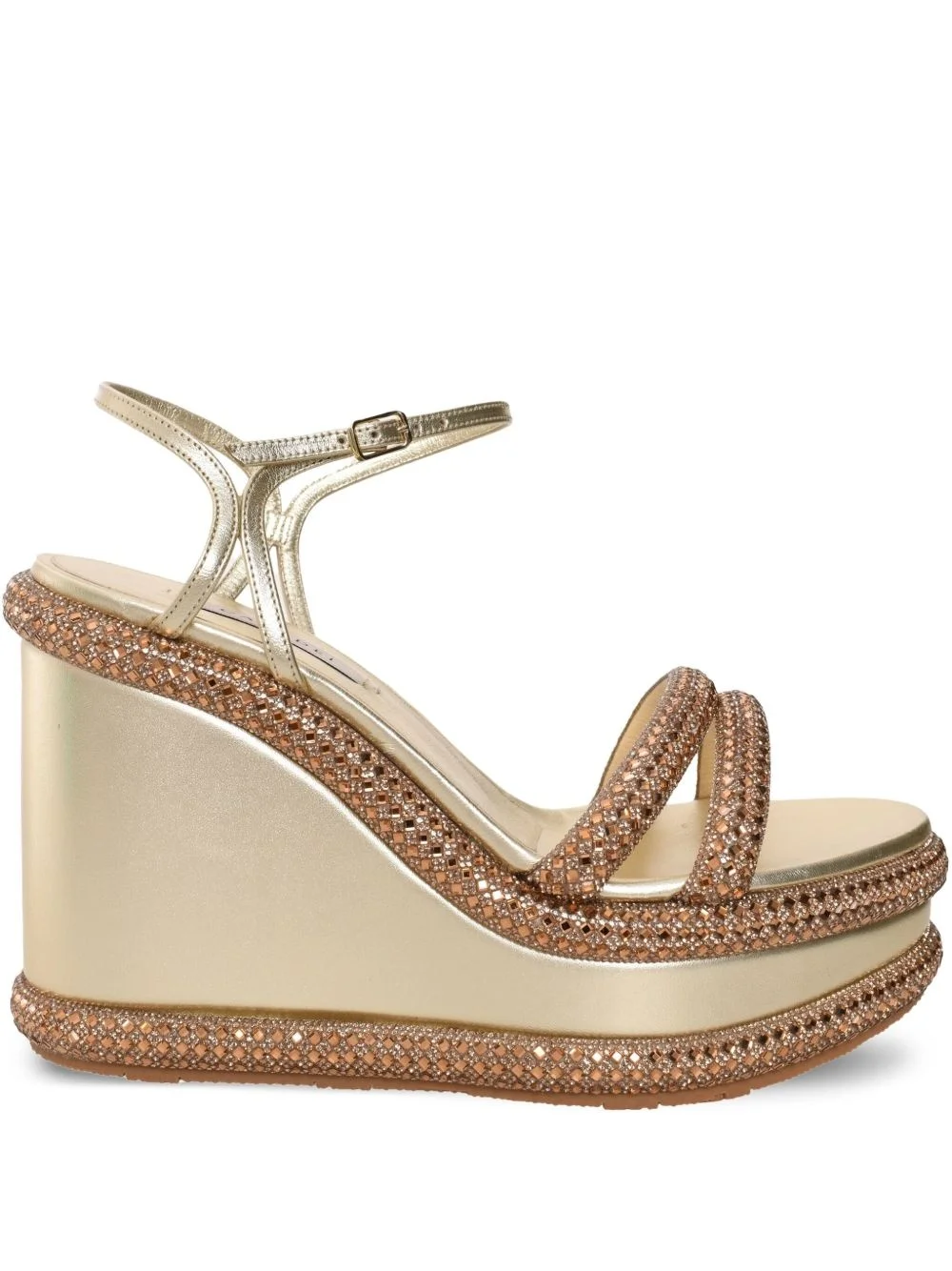crystal-embellished sandals Highlights - Gold-tone - Buckle-fastening ankle strap - Wedge heel - Branded footbed - Open toe Made in Italy Composition Outer: Kid Leather 100%, glass 100% Lining: Kid Leather 100% Sole: Rubber 100%