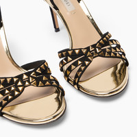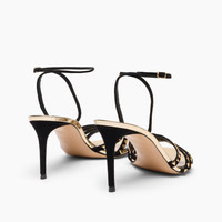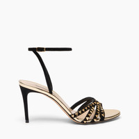 Crafted of fine black suede, the Divine sandal with an 8-cm stiletto heel combines femininity and character with refined measure. The thin straps delicately intertwine, creating a sophisticated play of transparency. The ankle strap ensures stability and momentum, enhancing the line of the leg. To embellish the silhouette, small faceted gold metallic triangles draw bright and unexpected geometries. A model with a multifaceted personality, designed to stand out with style on the most exclusive evenings. Details - Suede - 100% Kid - Leather covered heel 80 mm / 3.1 inches - 100% Made In Italy - Code: 1L408A0801C29039000