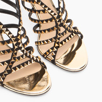 Crafted from fine black suede, the Divine sandal with a 10 cm stiletto heel embodies bold and sophisticated elegance. The thin straps intertwine around the instep with sensual delicacy, creating a refined play of transparencies. To embellish the silhouette, small facetted gold metal triangles draw bright and unexpected geometries. A model with a multiform personality, designed to stand out with style on the most exclusive evenings. Details - Suede - 100% Kid - Leather covered heel 100 mm / 3.9 inches - 100% Made In Italy - Code: 1L407A1001C29039000