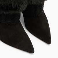 Designed for those who love to stand out even at high altitudes, Casadei presents the Double Face boot. Crafted from black faux fur with a mink effect, this model reimagines apres-ski style with a couture touch. Decorative buttons, inspired by classic ski bombers, add a sporty-chic detail that enhances the boot’s sophisticated character. The 8 cm stiletto heel elongates the silhouette, maintaining a feminine allure even in the coldest settings. A true must-have in the winter wardrobe for those seeking a boot that blends warmth, style, and personality. Details - Suede calfskin leather, mink-effect faux-fur - 50% Calf and 50% Polyester - Leather covered heel 80mm/3.1 inches - 100% Made In Italy - Code: 1S398A0801T05619000