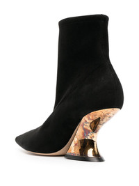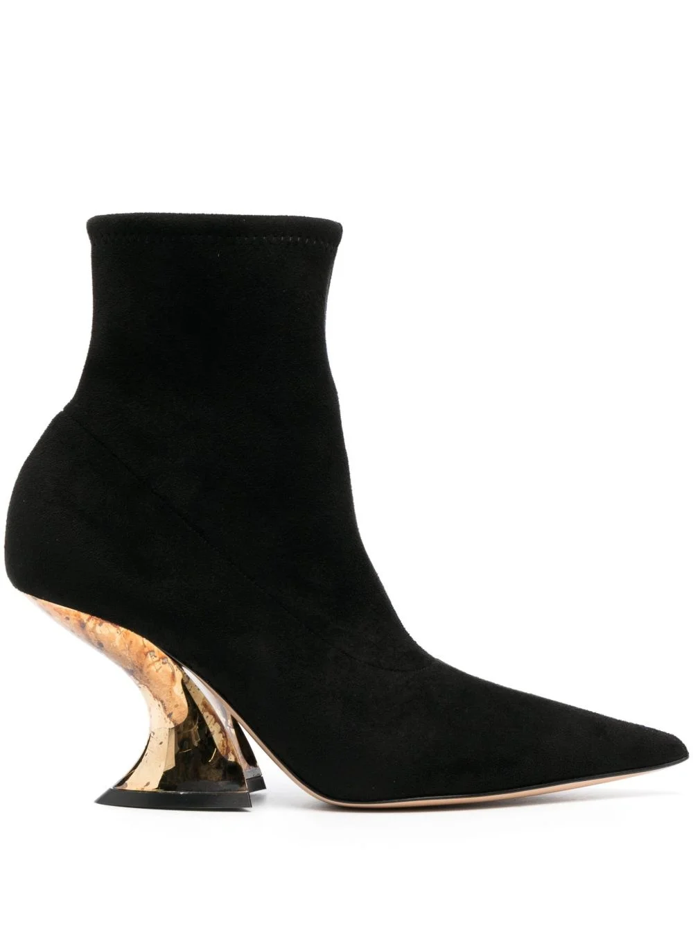 Elodie 85mm ankle boots Highlights - Black/gold-tone - Calf leather - Suede - Pointed toe - 85mm high block heel - Ankle-length - Sock-style ankle Made in Italy Composition Suede 100% SIZE & FIT Measurement CIRCUMFERENCE 9.44 in(24 cm) HEEL 3.34 in(8.5 cm) HEIGHT 5.11 in(13 cm)