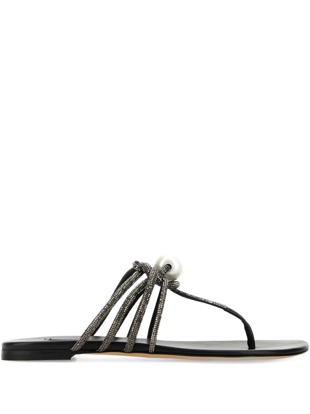 Labuan slides Highlights - Black - Thong strap - Pearl detail - Crystal embellishment Made in Italy Composition Outer: glass 45%, Polyester 45%, Kid Leather 10% Lining: Calf Leather 100% Sole: Calf Leather 100%
