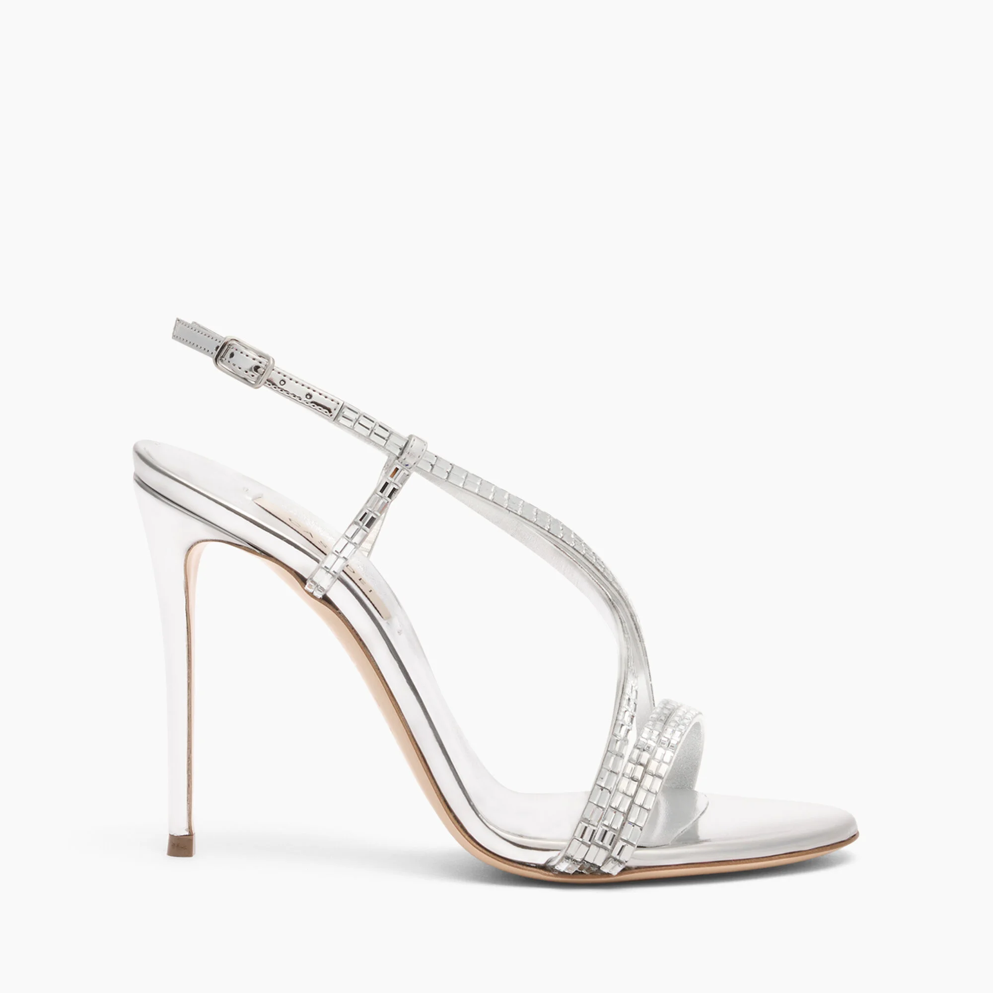 For all those who love to shine with sophistication, Casadei presents the Starsway sandal woven silver mirror effect on a metallic background. Its play of luminous reflections creates a unique sparkling effect, catching every eye. The asymmetrical lines that wrap around the foot are embellished with tiny glimmers, similar to the sparkle of diamonds, adding a touch of magic. On the 10 cm Julia heel, this model will become a must-have in your wardrobe, ready to make you shine on any occasion! Details - Mirror effect fabric on a metallic background - 40% Polyester and 60% Polyurethane - Mirror effect fabric covered heel 100 mm / 3.9 inches - 100% Made In Italy - Code: 1L402A1001T05359700