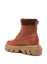 Generation C leather boots Defined by their oversized sole, the Generation C boots are one of Casadei's AW23 iconic silhouettes. This iteration is crafted from pebbled leather, featuring a practical lace-up fastening and a signature logo applique. Highlights - Caramel brown - Calf leather - Pebbled texture - Suede panels - Applique logo - Pull-tab at the heel - Front lace-up fastening - Ankle-length - Round toe - Ridged rubber sole Made in Italy Composition Leather 100% SIZE & FIT Measurement HEEL 2.55 in(6.5 cm) CIRCUMFERENCE 9.44 in(24 cm) HEIGHT 6.29 in(16 cm) PLATFORM 1.77 in(4.5 cm)