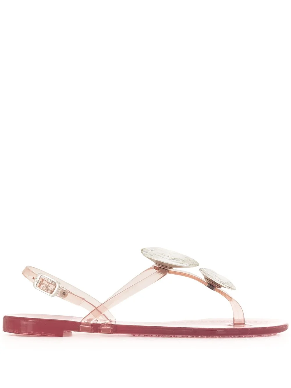heart crystal-embellished sandals Highlights - Tea rose pink - Crystal-embellished heart strap embellishment - Jelly - Open toe - Thong strap - Chain-link trim - Branded insole - T-bar strap - Buckle-fastening slingback strap - Flat heel Made in Italy Composition Outer: PVC 100% SIZE & FIT Measurement HEEL 0.47 in(1.2 cm)