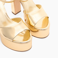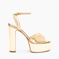 For lovers of heights, Casadei presents the interstellar Patty plateau for this Fall/Winter 25-26 collection. Reminiscent of the 1970s, the 8cm quarry plateau addresses the theme of “beautiful and walkable” with style and grit. Made of platinum mirror-effect fabric on a metallic base, it gives a luminous and magnetic effect that catches every eye. The chunky 13 cm heel, perfectly balanced by the platform, slims the figure while ensuring stability and comfort. Completing the design is the unmistakable C-Chain buckle that makes this model truly unique. Details - Mirror effect fabric on a metallic background - 40% Polyester and 60% Polyurethane - Leather covered heel 130 mm / 5.1 inches with plateau 30 mm / 1.18 inches - 100% Made In Italy - Code: 1L405A1301INTER1100